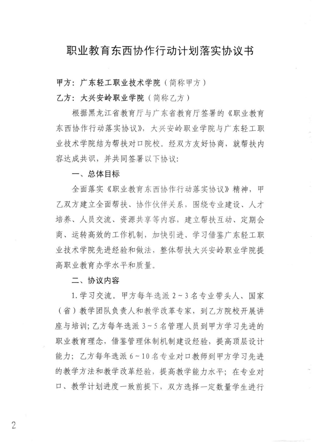 广东轻工职业技术学院与大兴安岭职业学院职业教育东西协作行动计划落实协议书