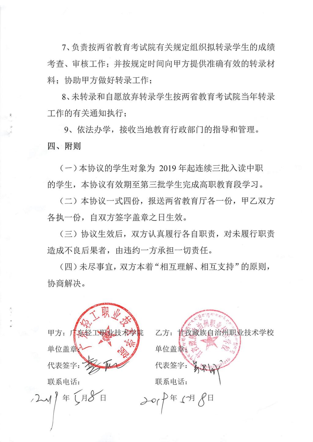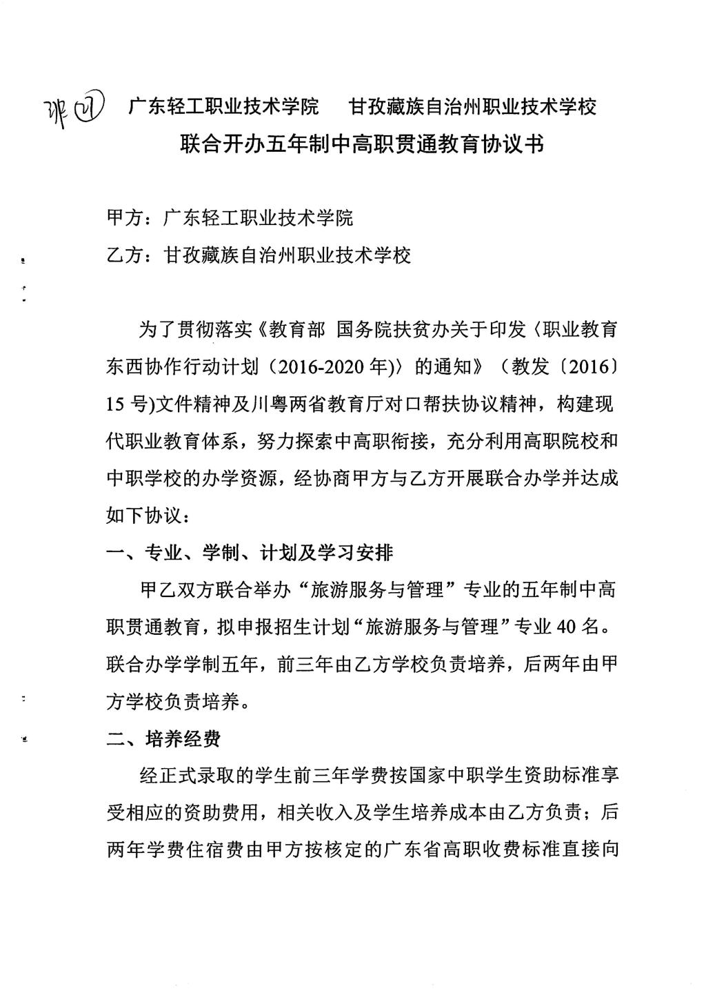 广东轻工职业技术学院与甘孜藏族自治州职业技术学校联合开办五年制中高职贯通教育协议书