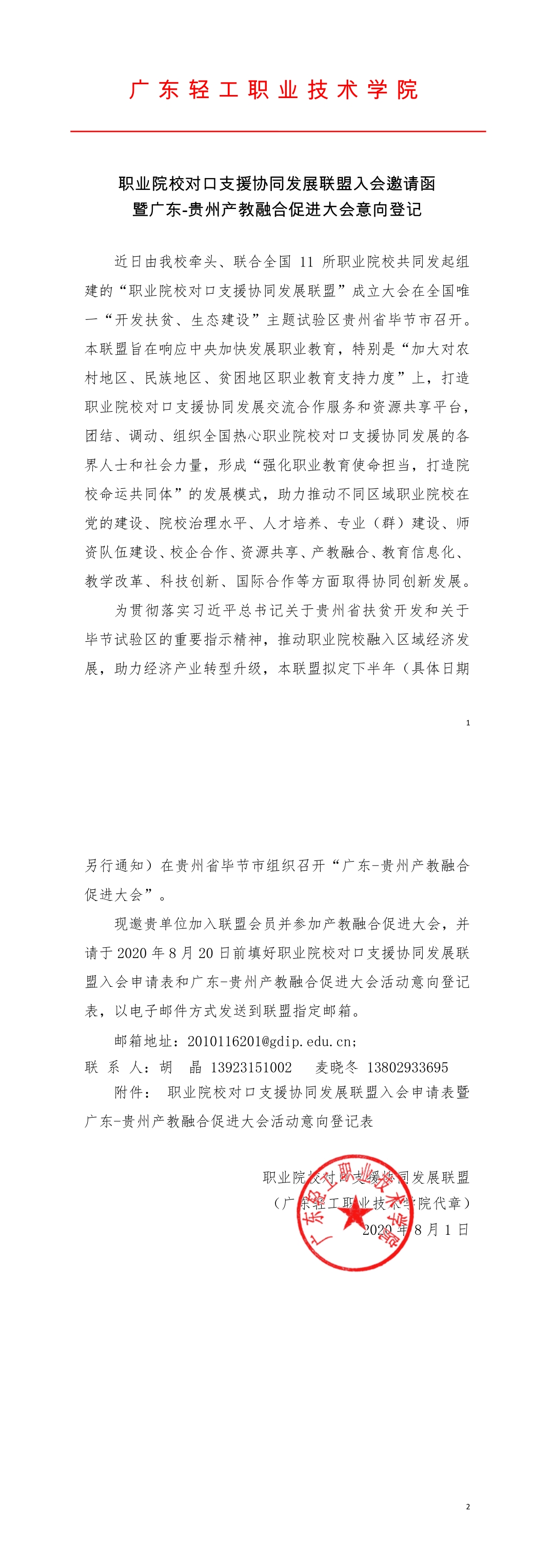 职业院校对口支援协同发展联盟入会邀请函暨广东-贵州产教融合促进大会活动意向登记