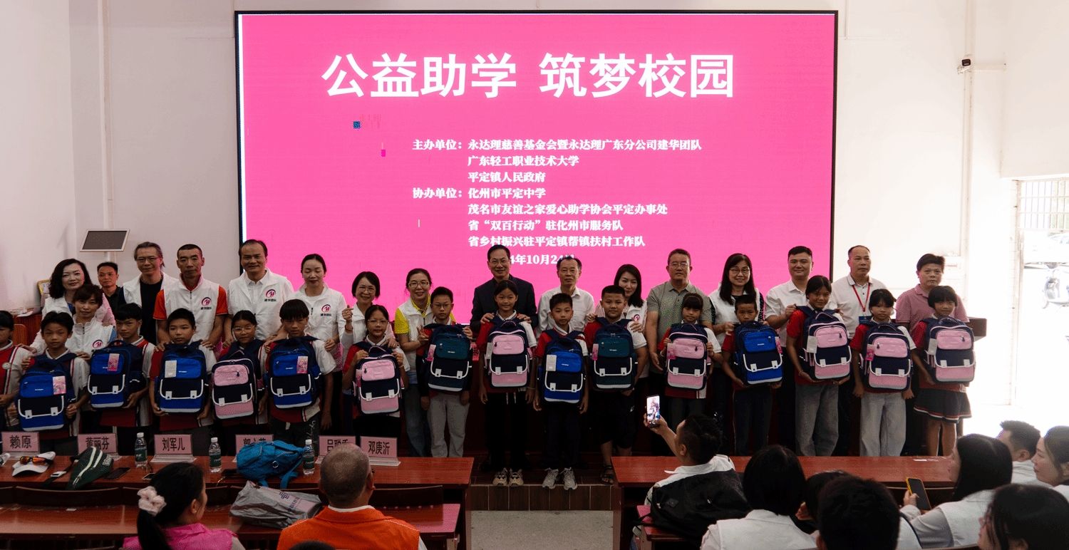 10月24日,由我校、平定镇人民政府、永达理慈善基金会共同主办的“公益助学,筑梦校园”爱心助学捐赠仪式在化州市平定中学举行。永达理广东分公司副总经理黄建华、我校工会副主席郝翼刚、平定镇人大主席林刚出席。